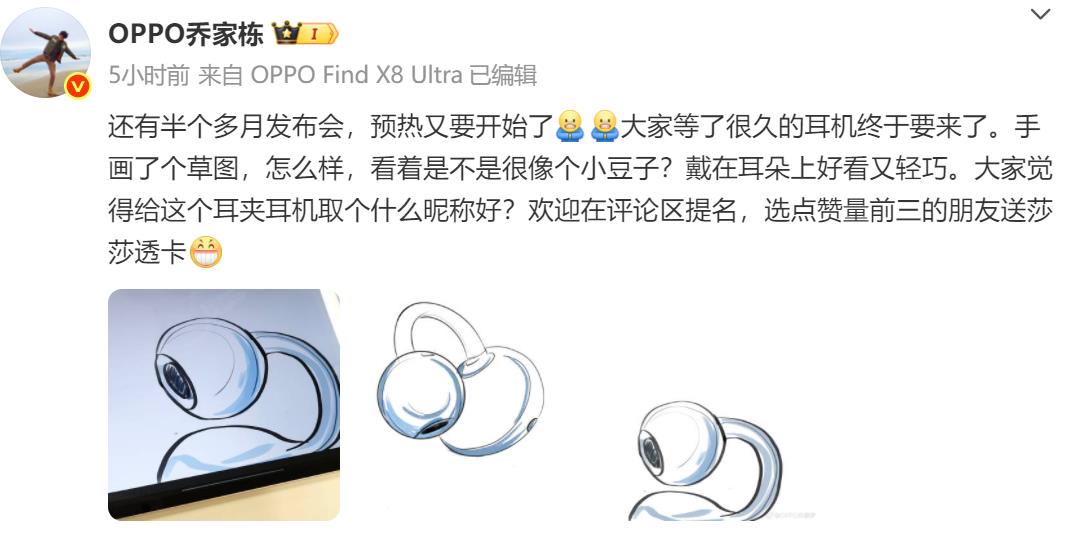 【环球网科技综合报道】4月28日消息,OPPO 智能生态产品总监乔家栋在其社交平台公布了 OPPO 耳夹式耳机草图,新品采用 “小豆子” 造型设计,预计将在 5 月发布。